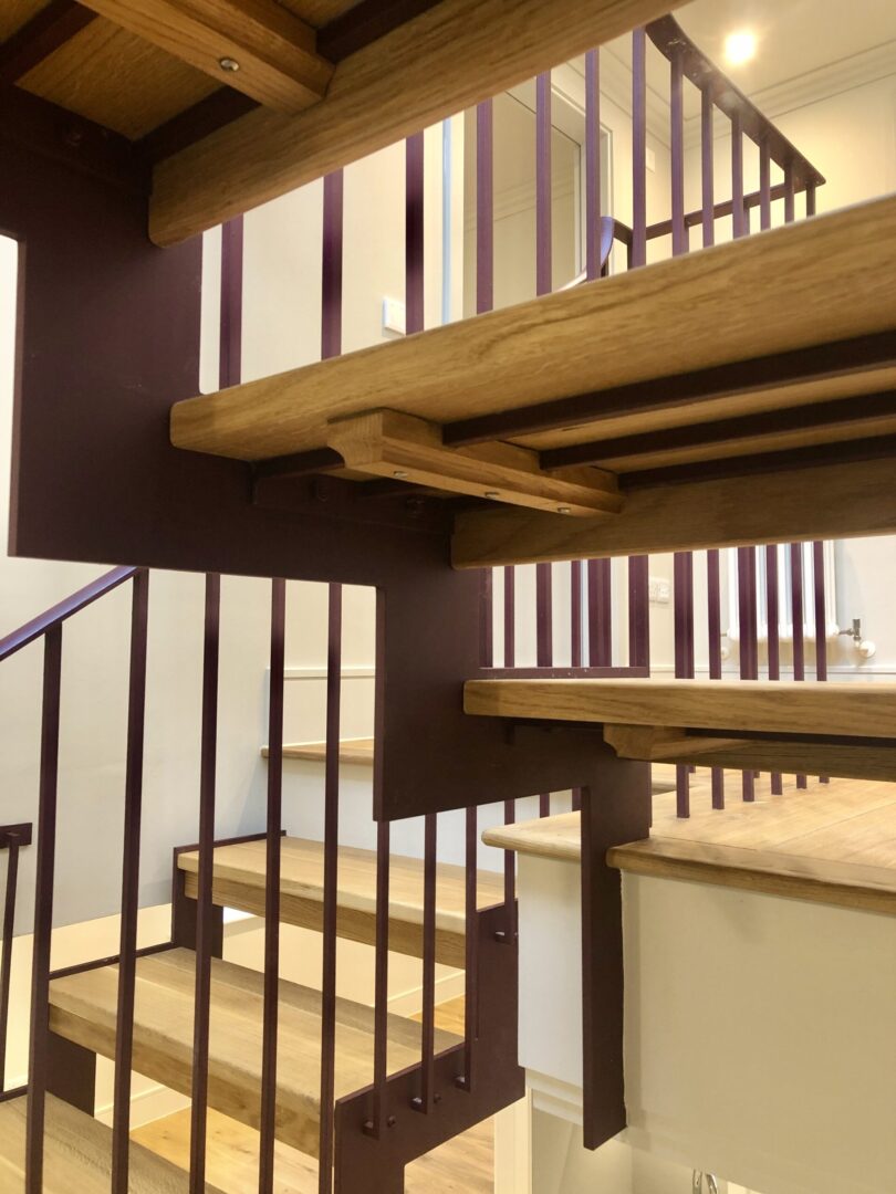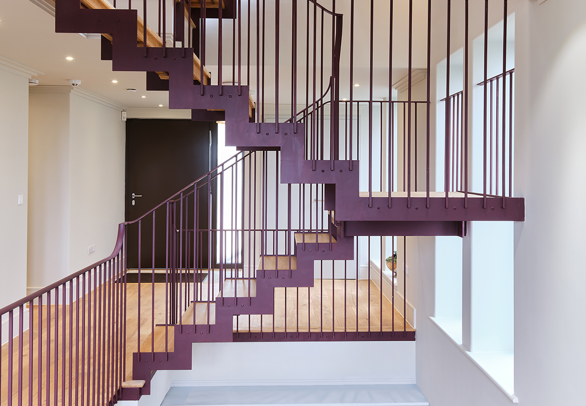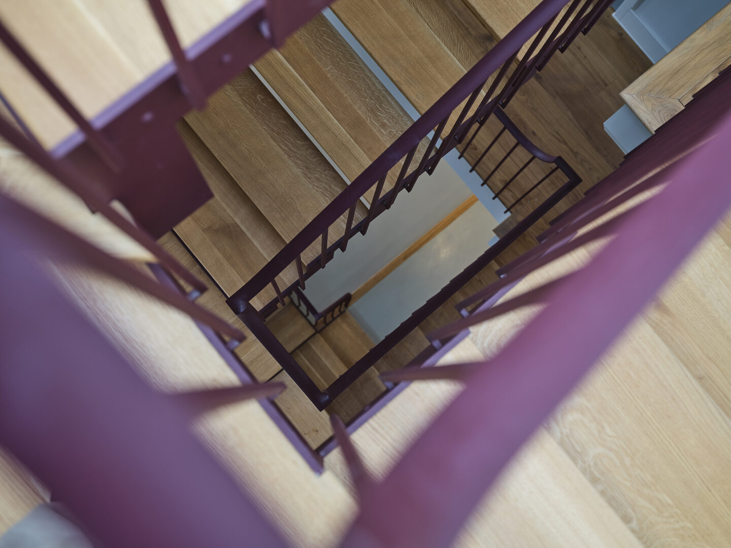 Will Sandy | Design Studio worked closely with the structural engineers and fabricators to create a unique steel staircase that runs the full height of the four-storey property. Each stair spindle folds through the stair runner to provide a continuous line that in turn supports each oak tread, linking into the oak flooring throughout the house. The mature cedar tree to the rear of the property posed an interesting design challenge. The tree root protection area informed the layout, with a floating cantilevered steel terrace enabling level access from the kitchen/living area out to the south facing rear gardens.