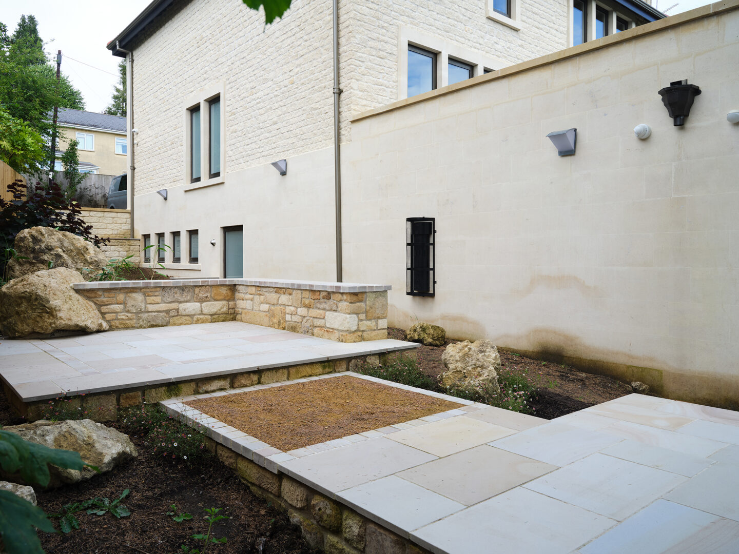 Large boulders saved from the house excavations, were integrated into a small, shaded terrace area to the side of the property. A simple planting palette of evergreens repeats throughout the garden, anchoring the perennial planting. Airy grasses and perennials blur the line between the terrace and the lawn, with gently clipped, mounded shrubs act as a foil for grasses against the rocks. A muted palette of greens and whites adds interest along the boundaries and in shadier areas, with a small orchard planted to the southern boundary providing screening and a catalyst for the productive food growing area.