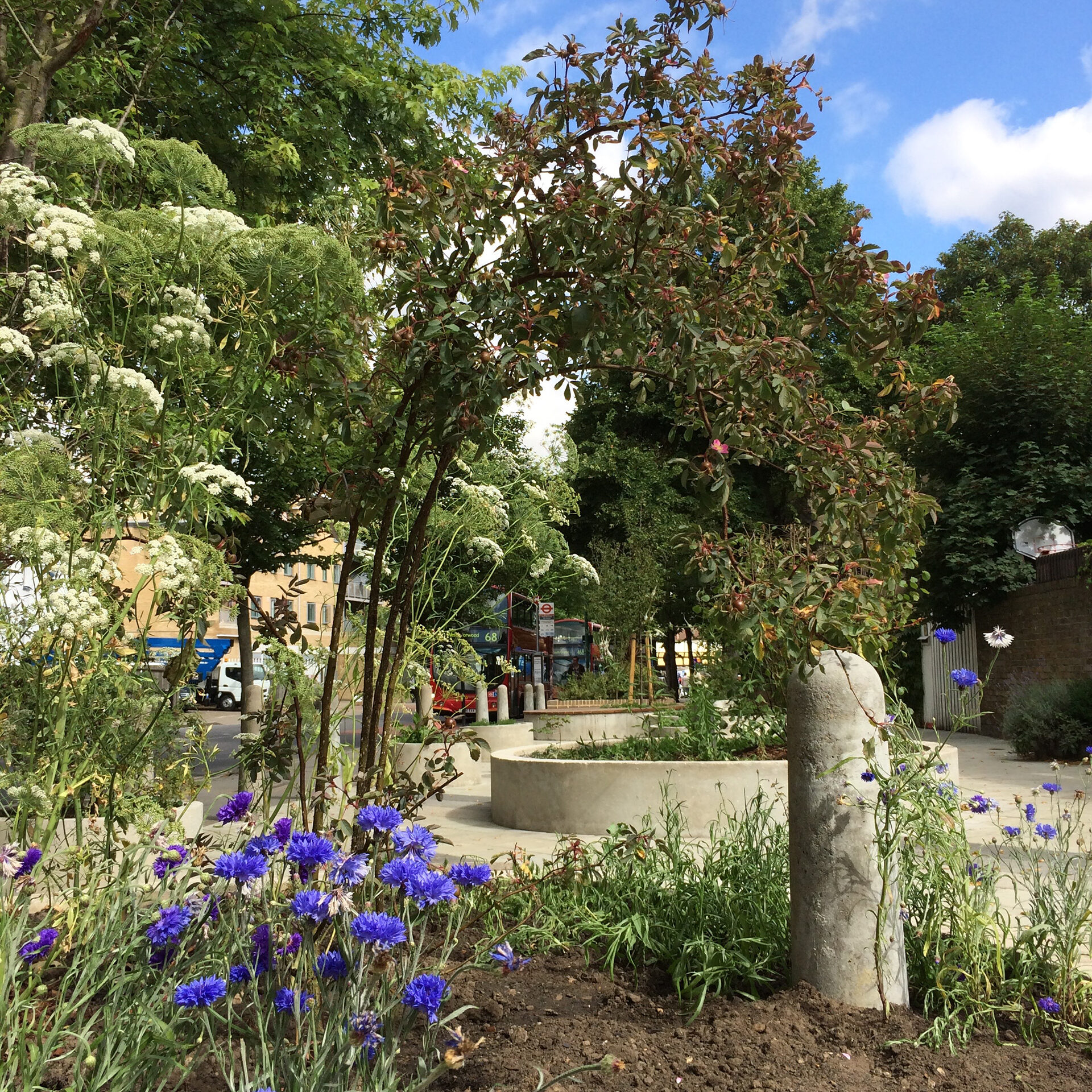 Each pocket park celebrates the local character of the neighbourhood. The first on Landor Road, Stockwell known locally as the Kerb Garden, utilised reclaimed granite kerbstones from a nearby highways project to provide a robust and unique aesthetic. While the Hoopla Garden in West Norwood embraced the forest of concrete bollards, introducing large circular concrete planters, like a giant’s game of hoopla – Never mind the bollards!