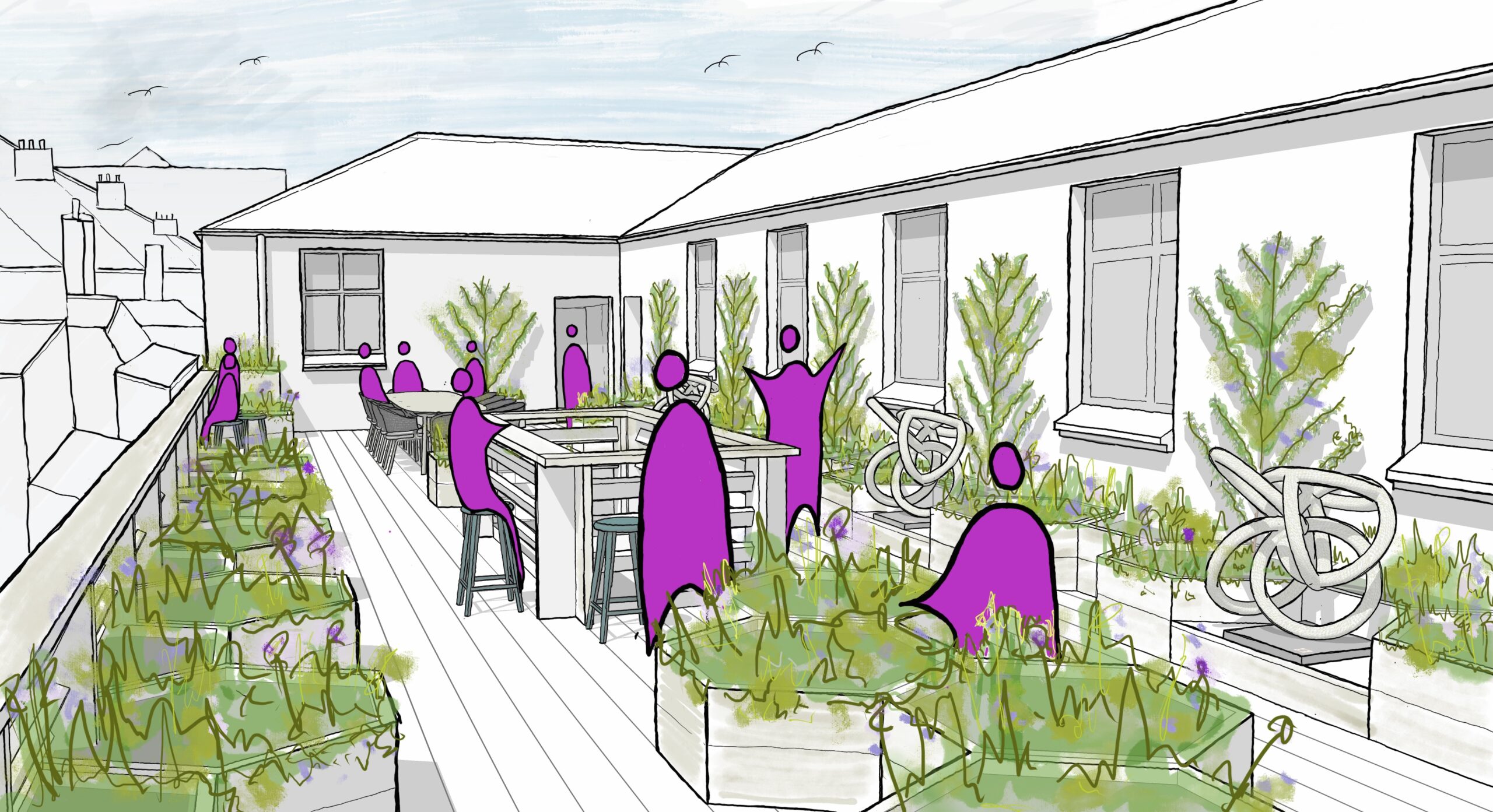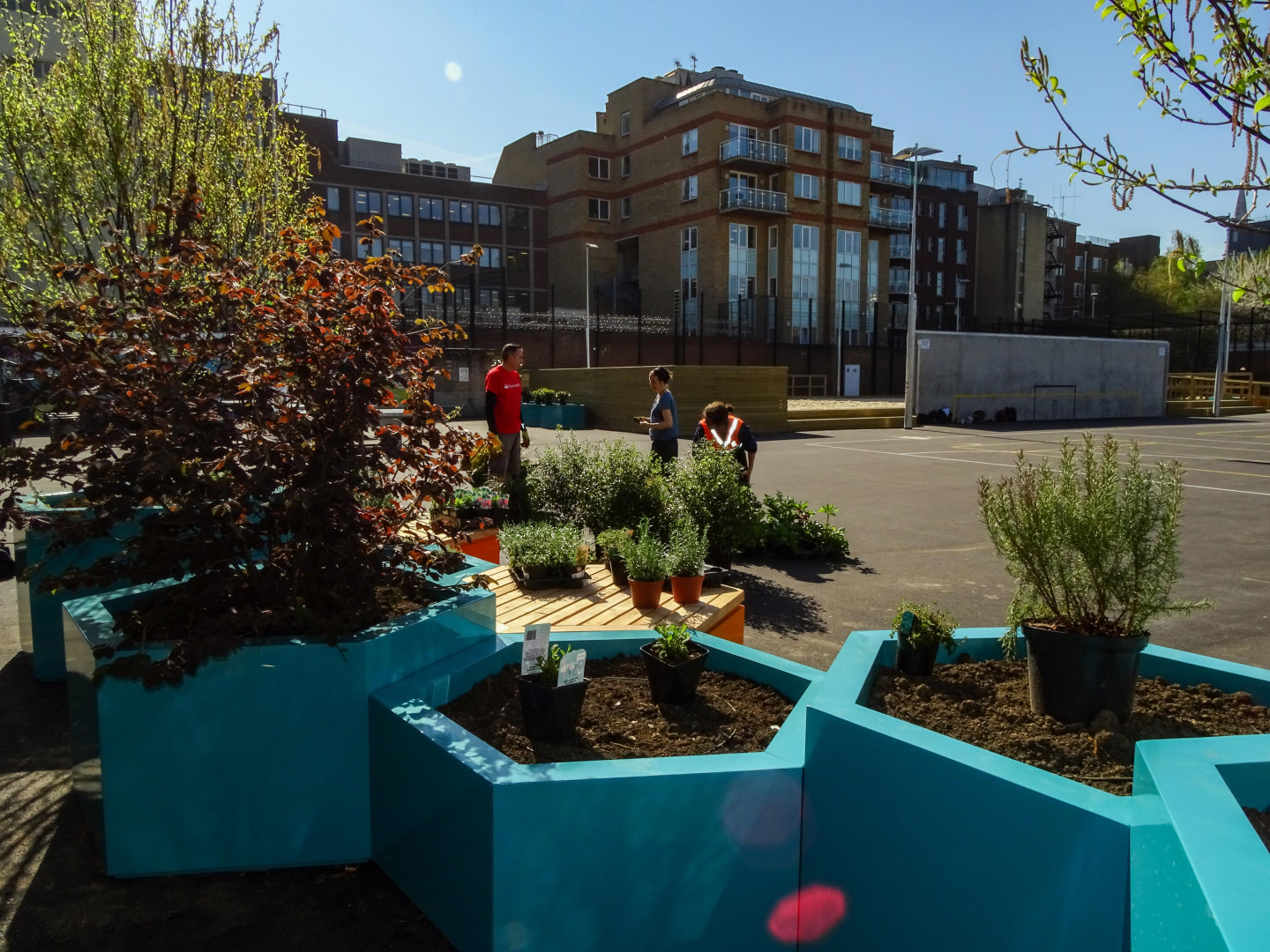 The design presents a light touch demountable structure that supports a series of modular hexagonal planters, plinths and seating areas. The design provides an accessible deck solution for multiple locations, bridging existing roof structures with easy install and removal to be used on future sites. The structural element has an integrated balustrade and screen to the alley and neighbouring properties. The system uses sustainably sourced materials. Its simple design can be constructed using local contractors with scope for training opportunities, while introducing water harvesting and attenuation systems to help alleviate local flooding.