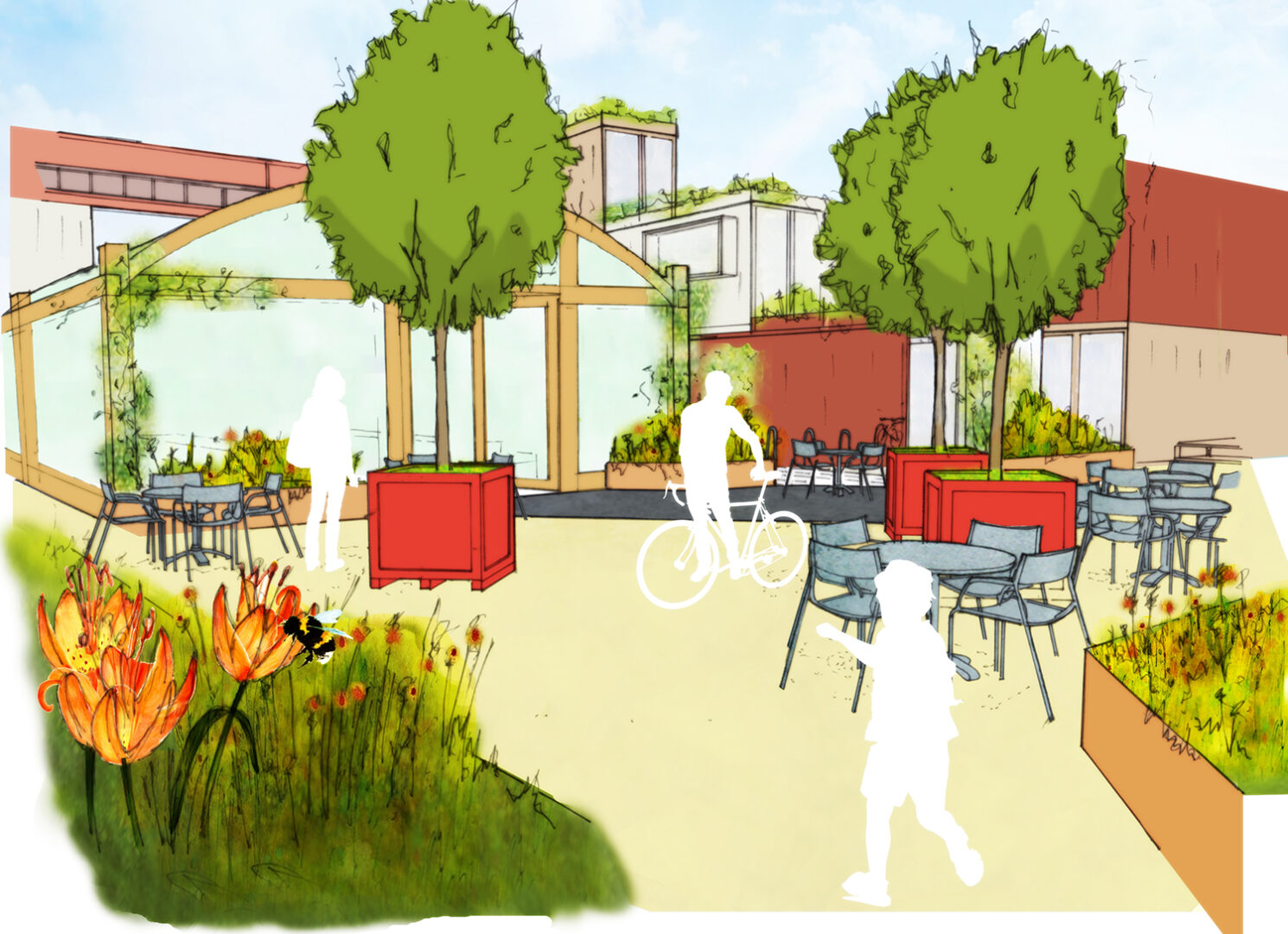 To support the centralised food and drink space, we established partnerships with the Clink Restaurant in Brixton Prison and the Sustainable Restaurant Association (SRA) who would co-manage the central restaurant/café space. Simple and accessible food offerings during the day, with more exciting events and activities of an evening. The first big idea was to have a cook-off between Raymond Blanc OBE (SRA President) and local legend Jeff the Chef, bringing his Caribbean cuisine to a new audience. It quickly became more than just food growing, developing a plant to plate approach to regeneration – we all eat right! Nearby Hill Mead Primary School agreed to run their whole years curriculum around the commercial and community side of food growing, using the site as a testbed for off site education.