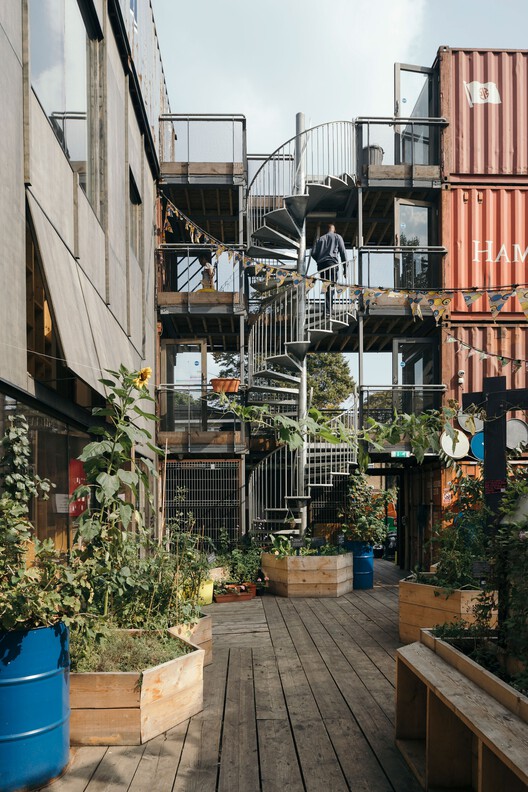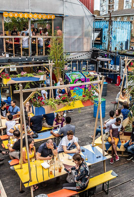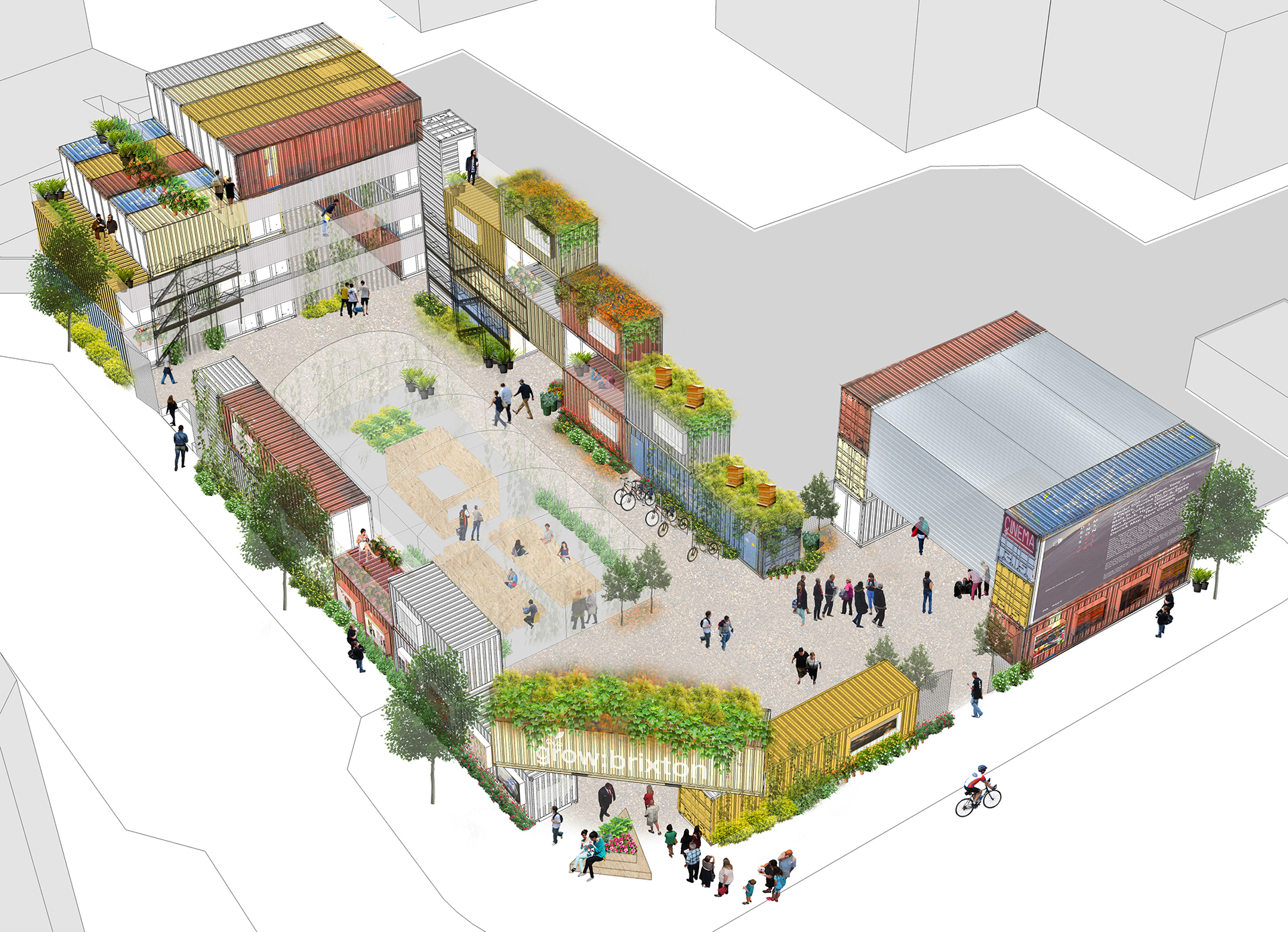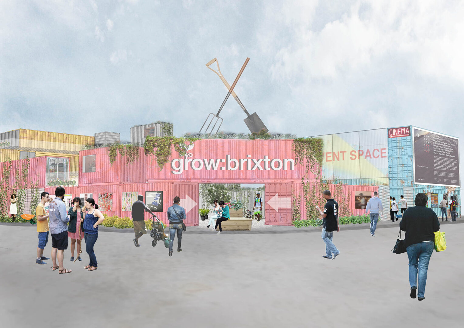 Grow:Brixton was established as a partnership between The Edible Bus Stop and Carl Turner Architects (now Turner Works) to deliver the meanwhile project at Popes Road, SW9. The approach was developed in response to an open expression of interest organised by the London Borough of Lambeth to find alternative use for this large site following the recent demolition of the temporary ice rink. As the project evolved, it transitioned into what became Pop Brixton.