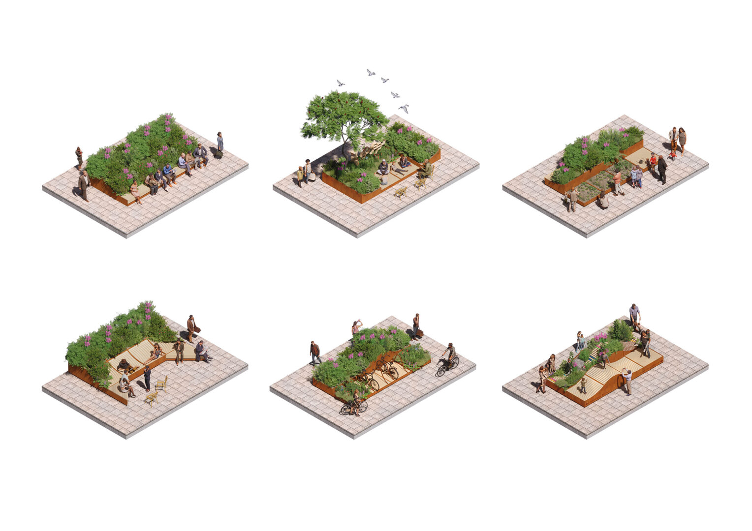 Modules can be configured to a variety of spatial types, supporting social and cultural programs, improving the environmental performance and strengthening the place value of each location. The system works as part of a wider landscape improvement or regeneration scheme or as a stand-alone activation and intervention.