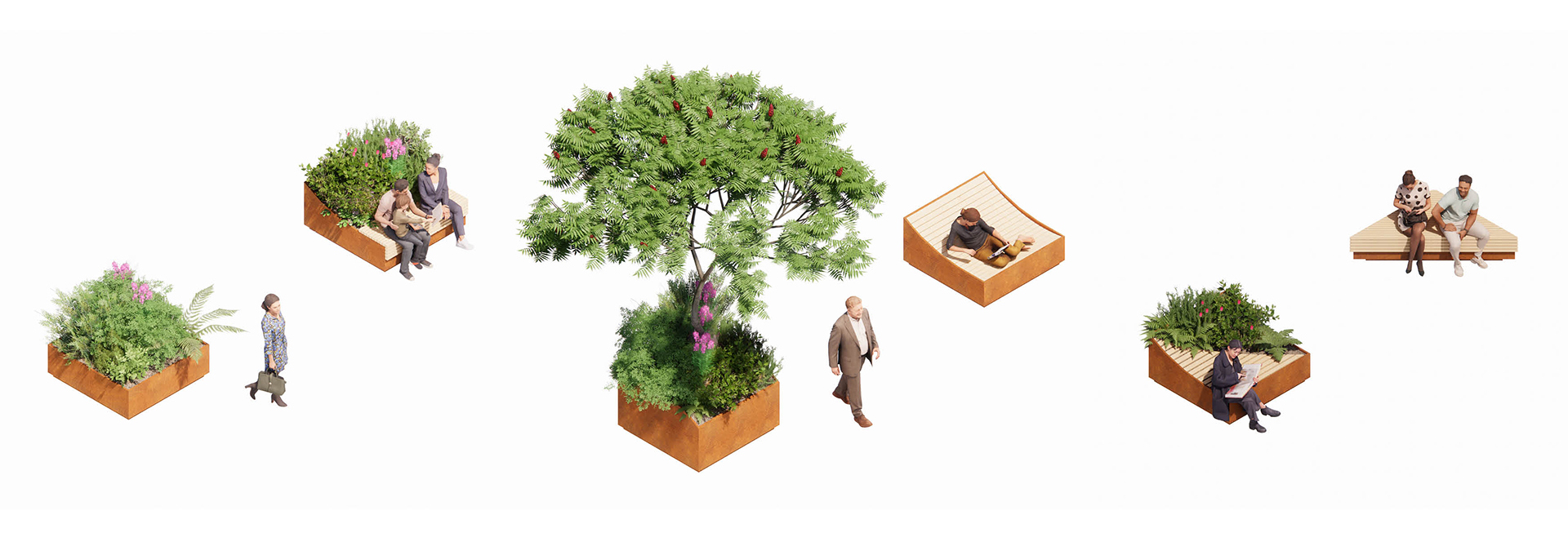 The modular elements are manufactured off site to minimise disruption. They are easily relocatable with standard lifting equipment with adjustable feet and lifting points built into the design of each unit. There is scope for digital integration for increased engagement and post occupancy evaluation to inform future uses and permanent public realm design.