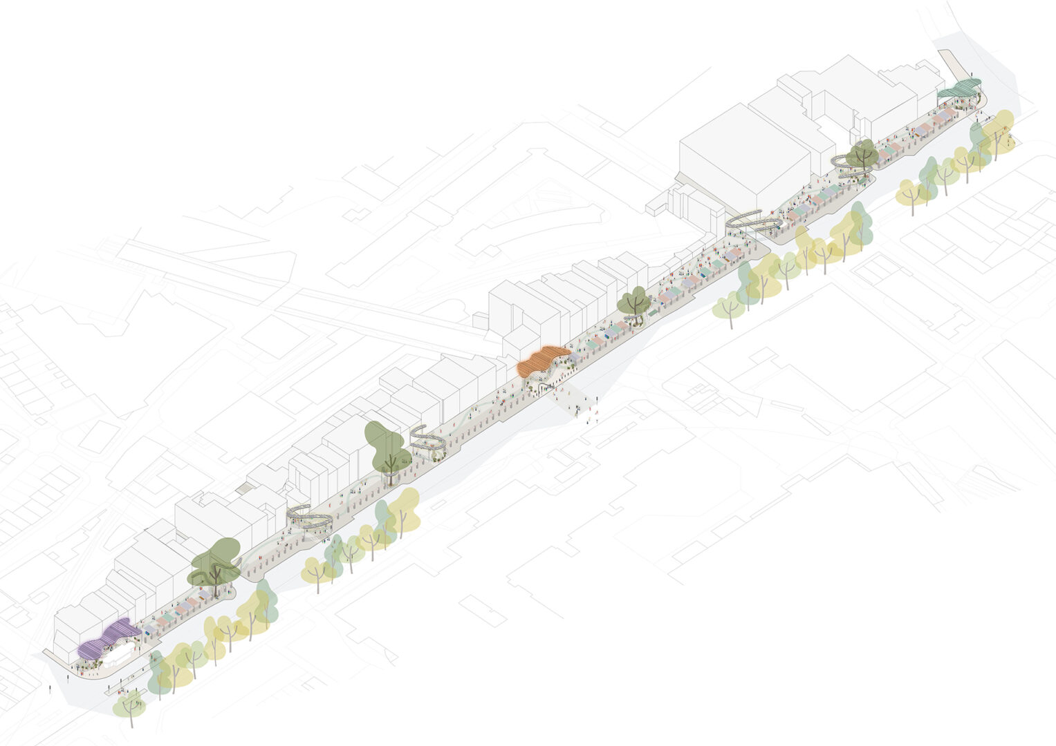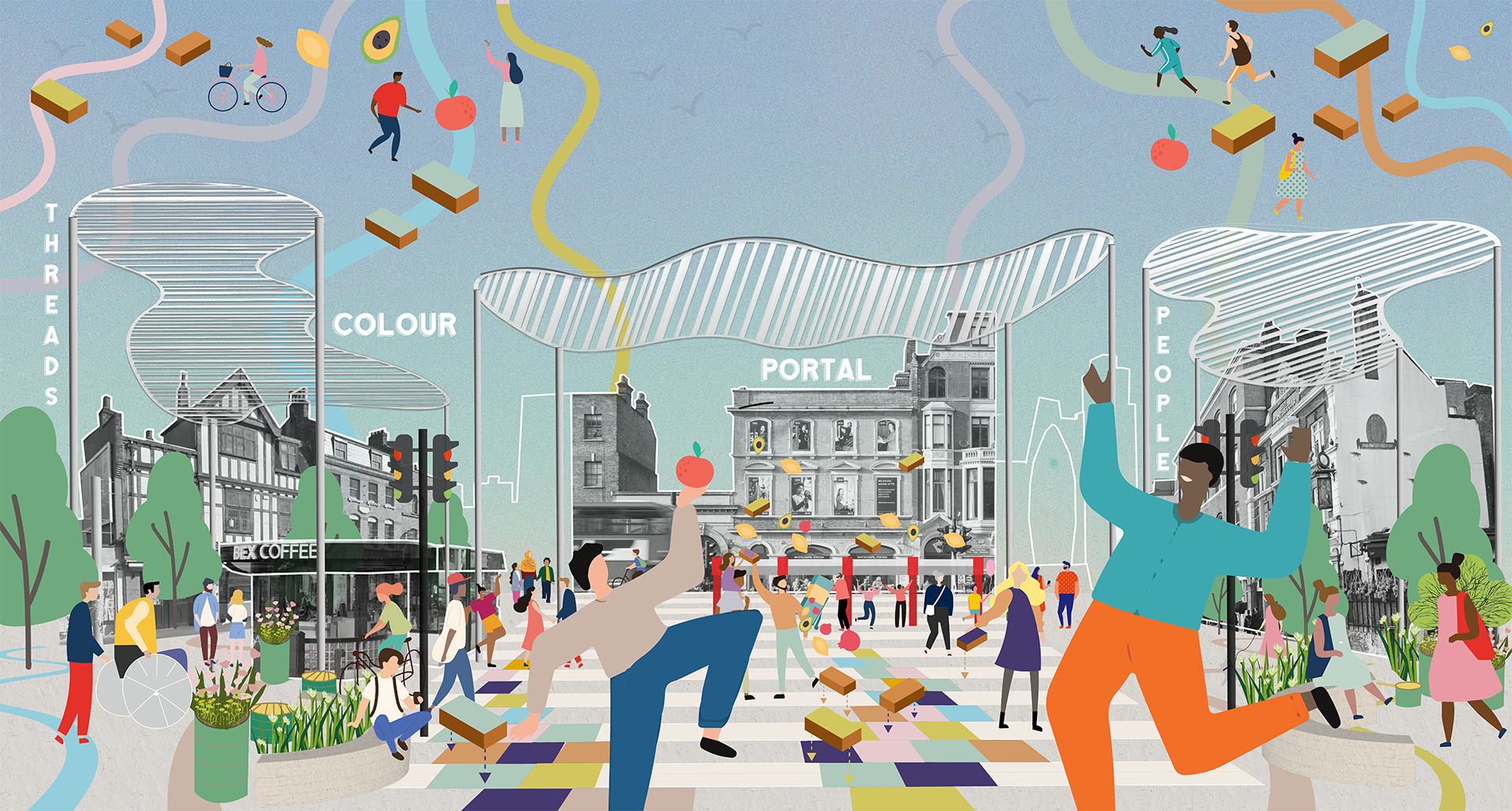 We propose a series of pocket spaces along Whitechapel Road each with its own identity but all performing as one holistic streetscape. Community-made bricks define the surface finishes and guide natural movement. Planting and seating create a social, comfortable mid-level space. A lightweight, permeable canopy offers shade without blocking views or CCTV. Seeing the gateways as a connected sequence creates a clear, unified journey, with community-made bricks forming the symbolic thread that roots each space in Whitechapel and guides people through it.