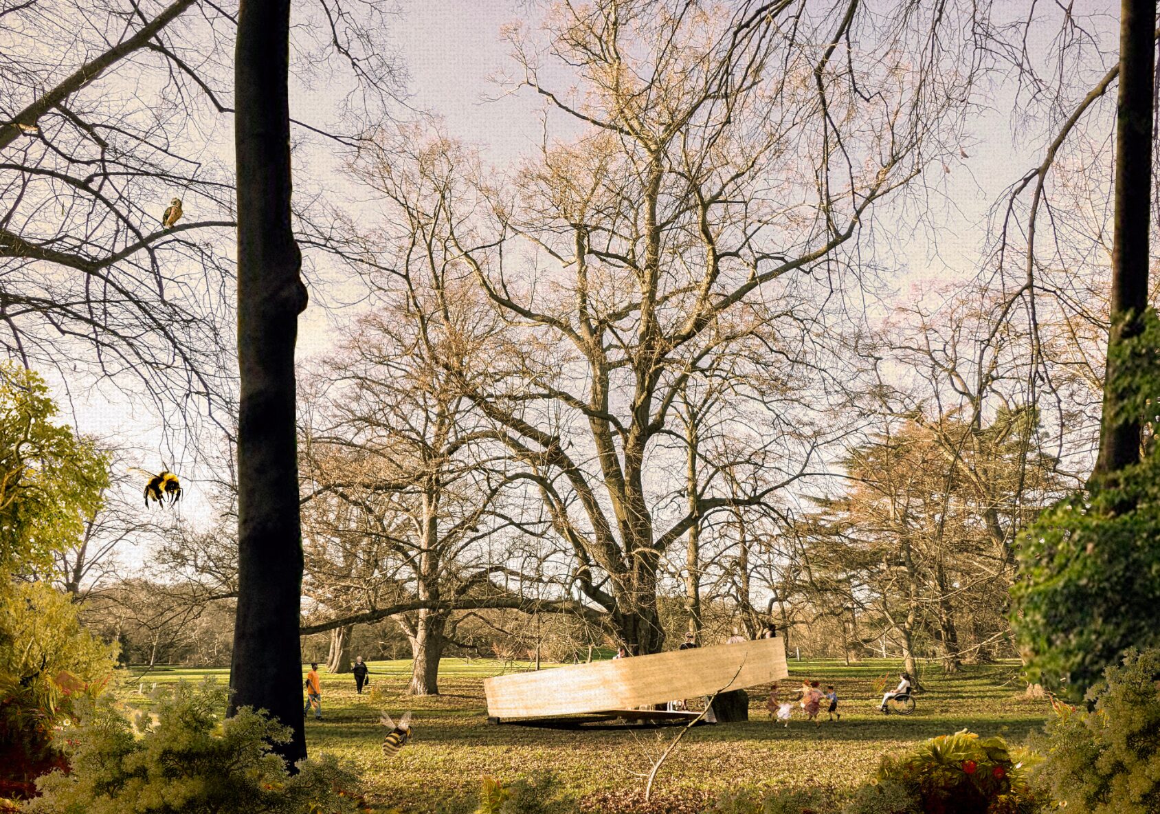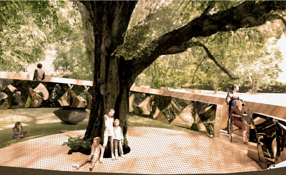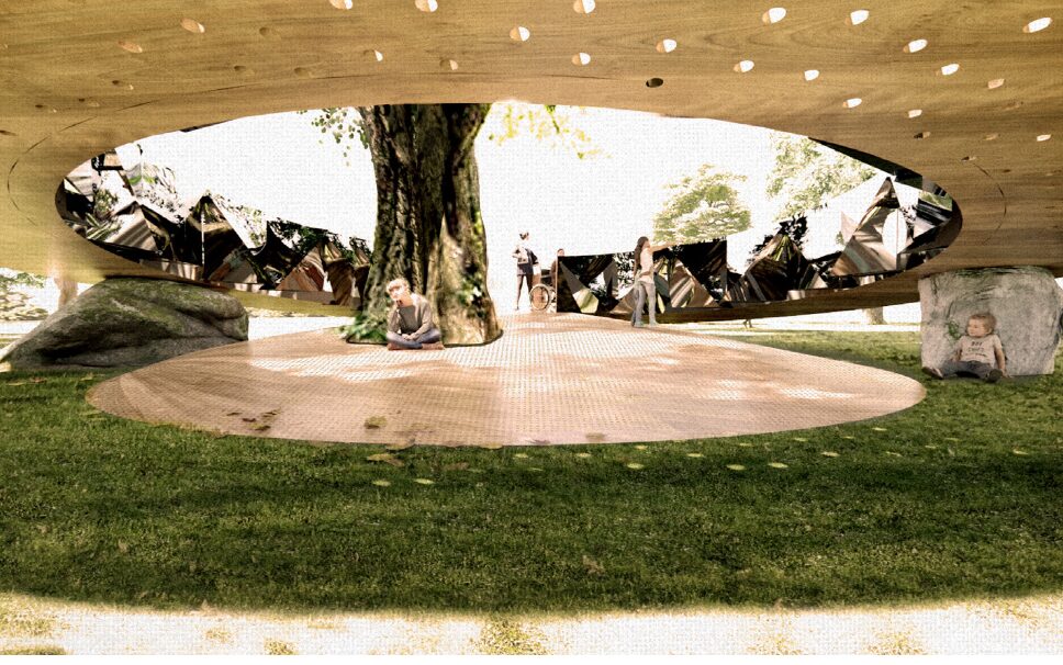 The design invites visitors to engage with the tree by framing unexpected elements of nature. The reflective materials celebrate the ever-changing nature of the tree, as it is constantly growing. The radial CLT form enclaves the multiplicity of sounds, highlighting human and non-human interactions surrounding the tree.